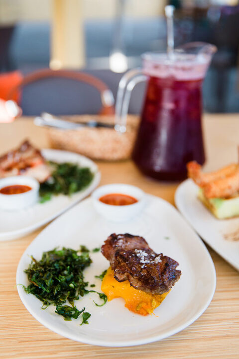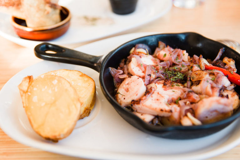 Vinera San Telmo – Pan-fried octopus with garlic and red onion, grilled “pluma iberica (pork) over curry oil pumpkin with fired rocket (arugula), stewed oxtail in crispy filo pastry, squid ink spagetti with garlic, pesto, grilled scallops, prawns, and seafood, stir-fried artichokes with Iberian ham